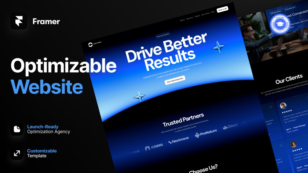 Boost your online presence with Optimizable, a sleek and powerful Framer template designed for agencies, startups, and marketers. This template is built for conversion optimization and growth, helping you increase sales, improve user experience, and maximize ROI through data-driven design.
